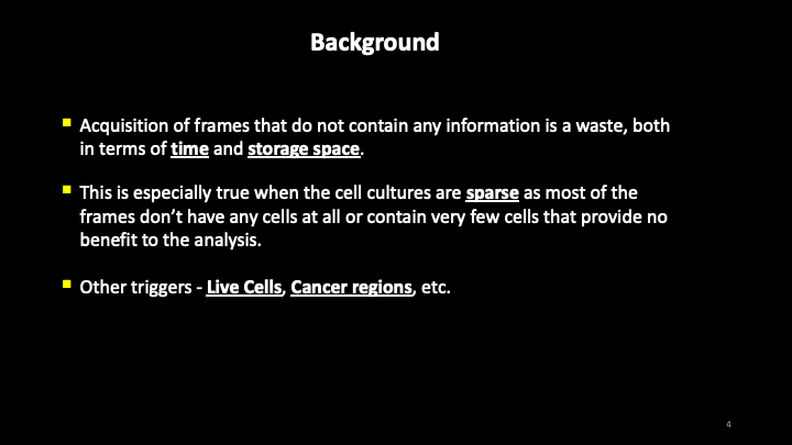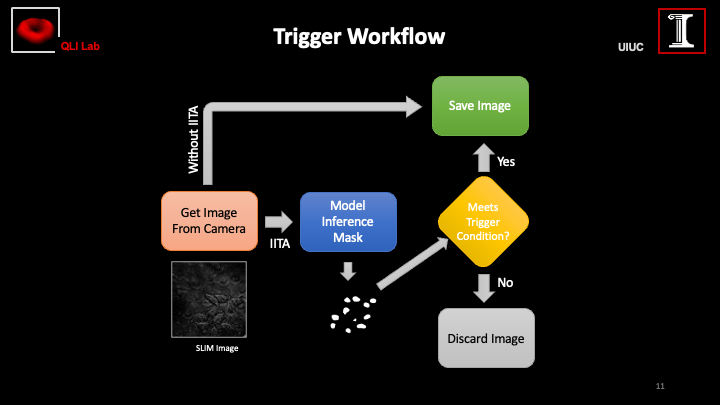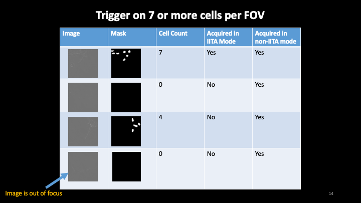 In bioreactor environments, the acquisition of live sample data often results in the collection of numerous frames with redundant or minimal information, leading to excessive time and energy spent on manual data curation by field experts. Current research in intelligent microscopy has primarily focused on improving the accuracy and speed of image analysis but has paid less attention to the efficiency and reliability of data acquisition itself. To address this gap, we develop the Intelligent Image Trigger Acquisition (IITA) system. This system employs an AI-driven decision-making framework to streamline the acquisition process. By incorporating an Efficient U-Net B5 architecture pretrained on ImageNet, the IITA system evaluates each frame in real-time to determine its relevance based on specific biological criteria such as cell count and viability. This approach significantly reduces the volume of non-informative data collected, thereby minimizing storage and computational demands. The system’s ability to selectively capture and store only pertinent frames reduces the need for extensive manual data curation, optimizing both time and energy resources. Results from live cell cultures in bioreactor settings demonstrate the system’s effectiveness in enhancing data quality and analysis efficiency. Future work will focus on expanding the system’s applicability to a wider range of cell types and biological conditions, further reducing the burden of manual intervention and paving the way for more autonomous biological research environments.